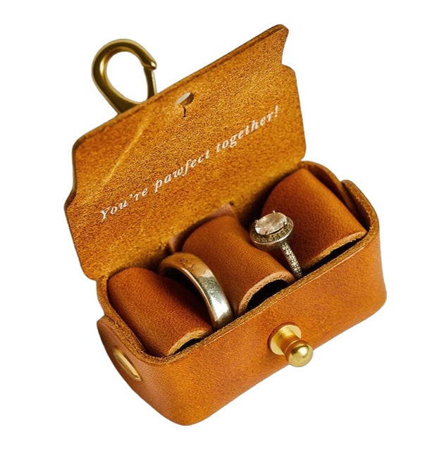 Handmade from luxury quality, sustainably sourced leather (available in white, black, tan brown or blush pink), the leather ring bearer pouches can be personalised with initials or a date on the outside and an optional message printed inside. The pouches are designed to safely hold both wedding rings inside and feature a secure solid brass clasp to attach to your dog's collar.